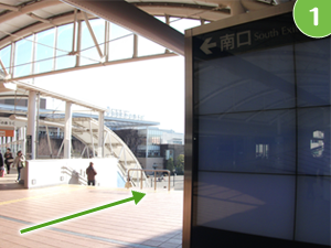 流山おおたかの森駅南口より、南口都市広場へお降り下さい。 階段左手にはエスカレーターもございます。 |