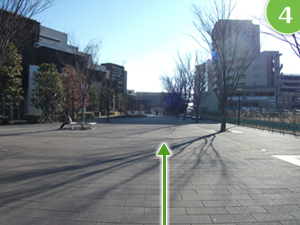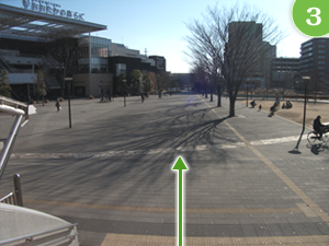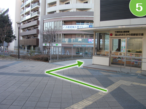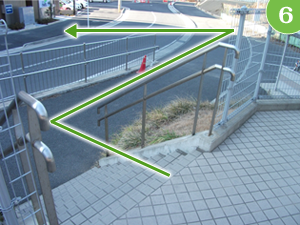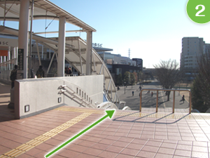 流山おおたかの森駅前交番の左側を通り、階段を降りて正面の道を渡ります。 階段左手にはスロープもございますので、車椅子などの方も安心です。 |